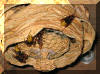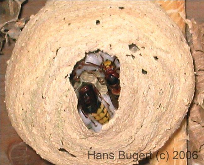 Hornissenarbeiterinnen die äußere Nesthülle abgetragen, um die Wabenetage