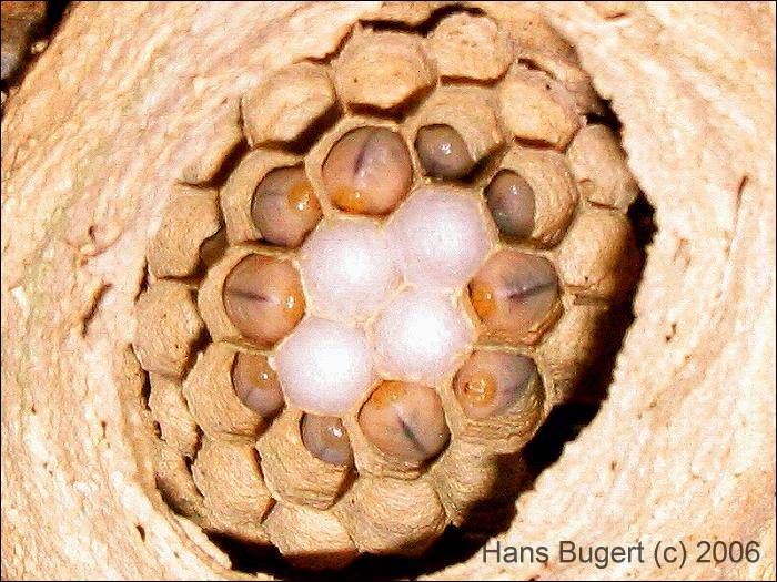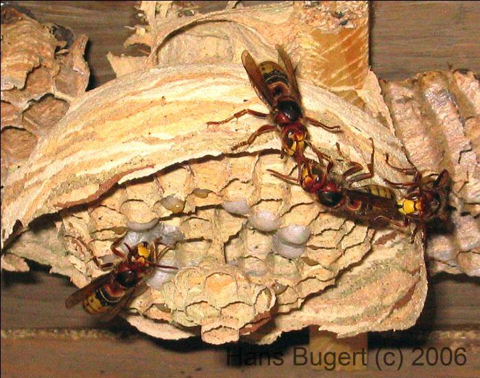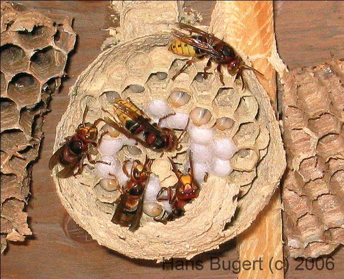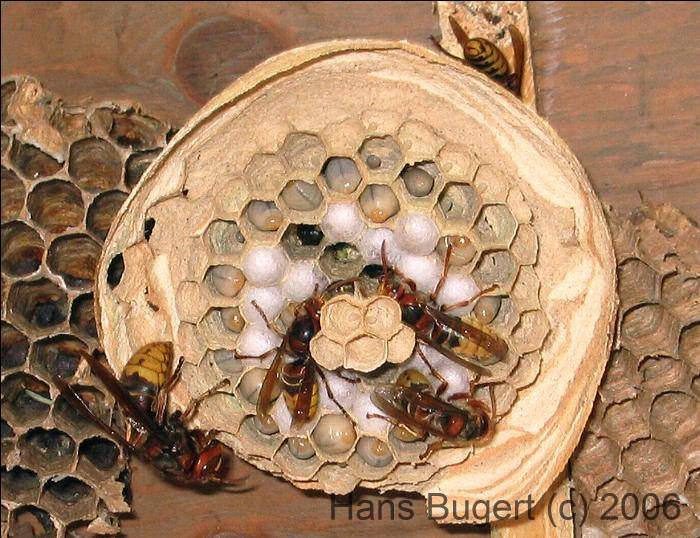 Foto oben kann man schön eine junge Hornisse beim reinigen der Wabenzelle