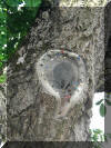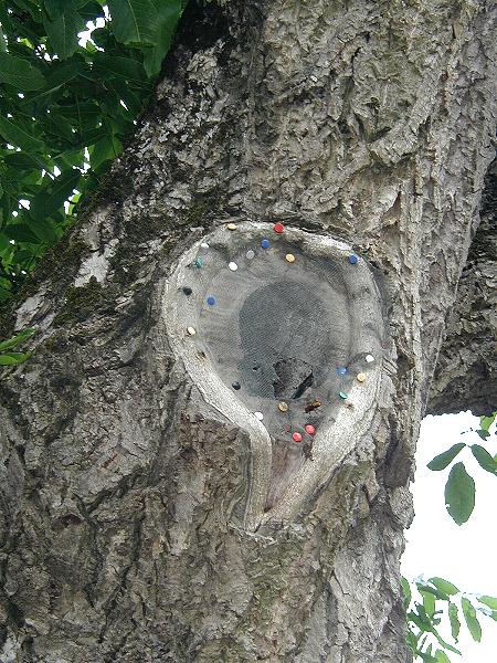 einem Einflugloch um den hohlen Ast gelegt, damit niemand an das Nest