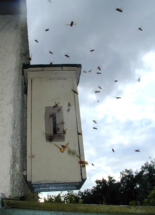 werde ich umflogen. Nachdem der Hornissenkasten wieder verschlossen ist,