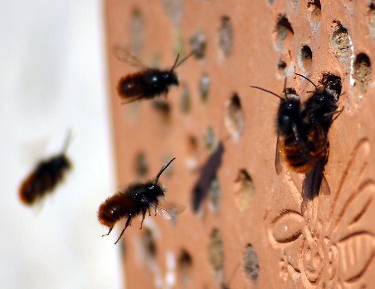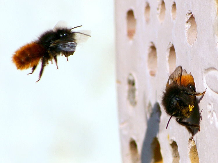 Roten Mauerbienen an der Nisthilfe zu entdecken und zu