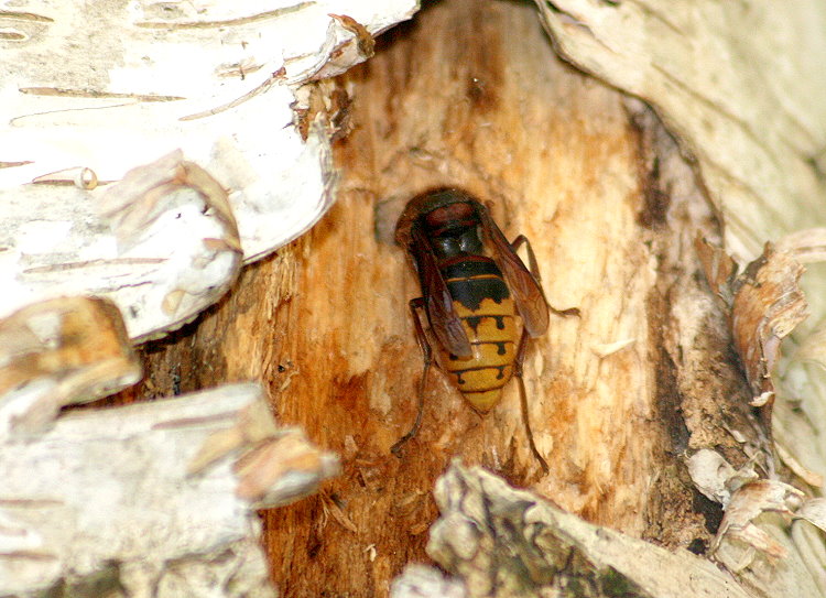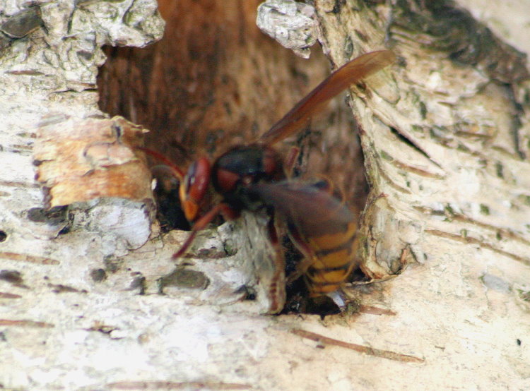 über Löcher in der Rinde gelangen zwei Hornissen an das Baumaterial,