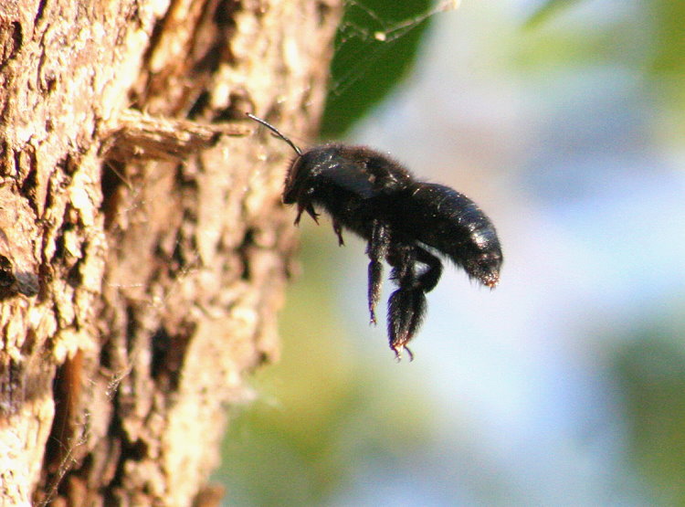 Hinterbeinen, mit Pollen schwer beladen, kriechen die Holzbienen in die