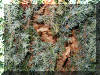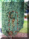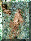 nach unten verlaufende Nest, in die dichten Zweige der Zypresse gebaut.
