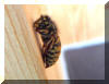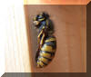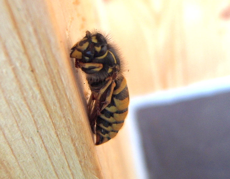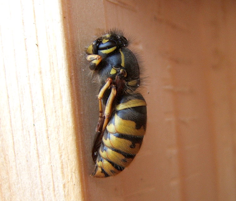 Wespenkönigin mit ihren Mandibeln am Holz festgeklemmt.
