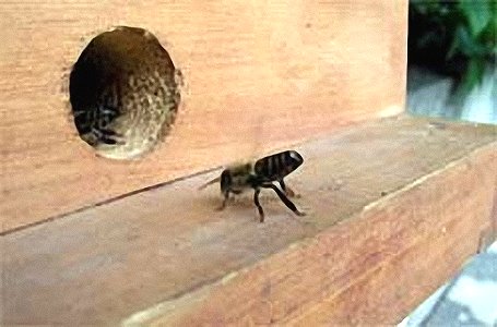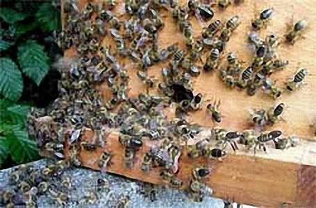 Vom Duft angelockt versammeln sich alle, noch außen fliegenden Bienen am Kasten.