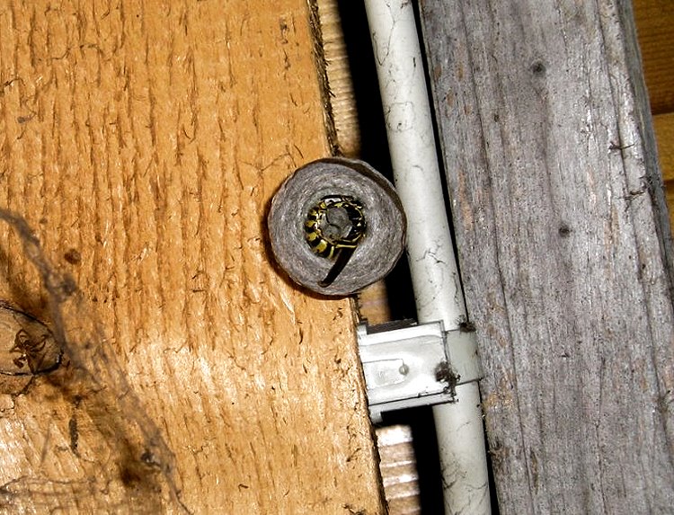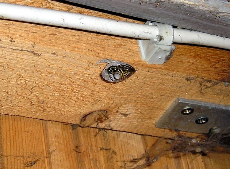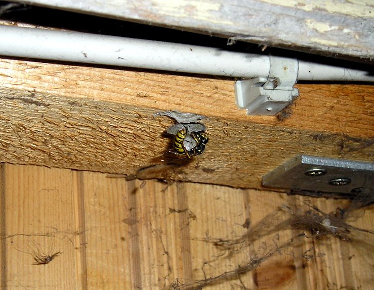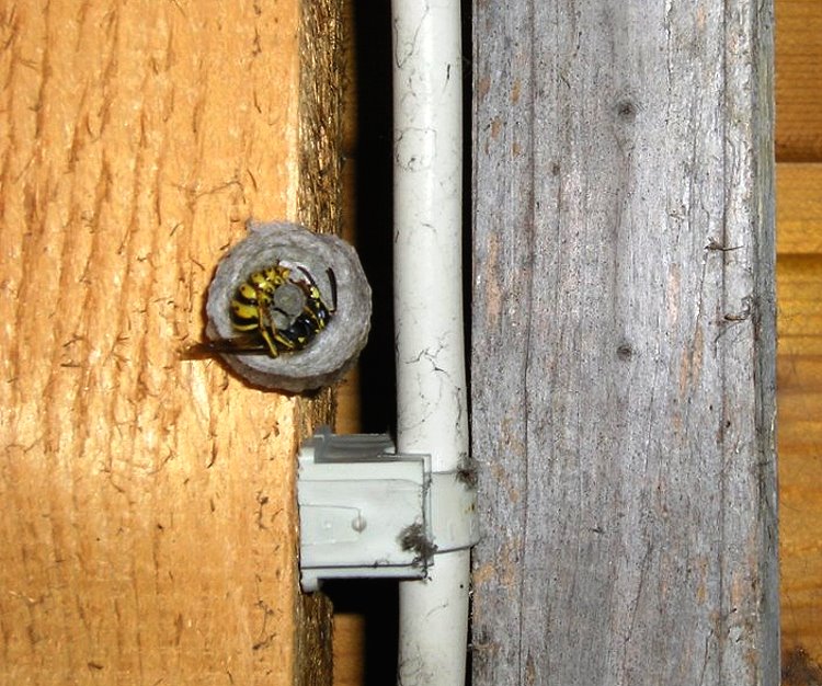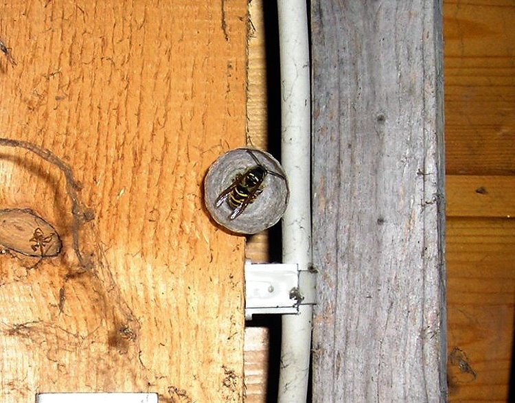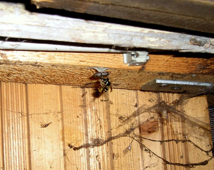 Königin einer Sächsischen Wespe zum Standort für die Nestgründung ausgesucht.
