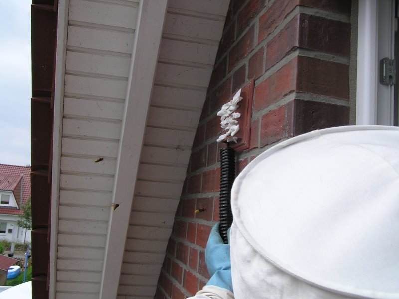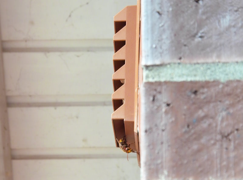 Außenmauer befindet sich im Lüftungsrohr das Hornissennest.