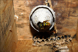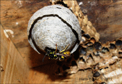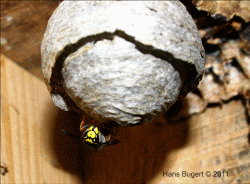 Und weiter geht´s... Heute entdeckt Hans Bugert die erste Nestgründung einer deutschen Wespe, im eingebauten Hornissenkasten seiner Gartenhütte. Dieses Anfangsnest hat bereits zwei Hüllen. Es scheint somit etwa schon sieben Tage alt zu sein.