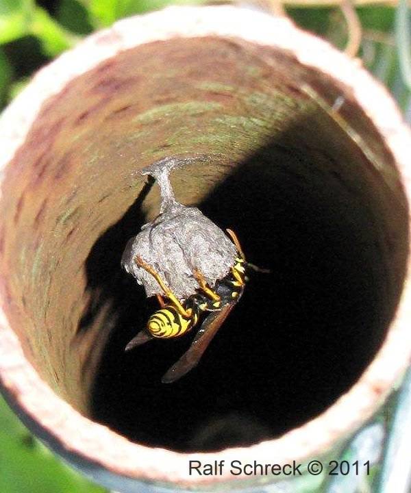 Nestgründung der Haus-Feldwespe im Rohr eines