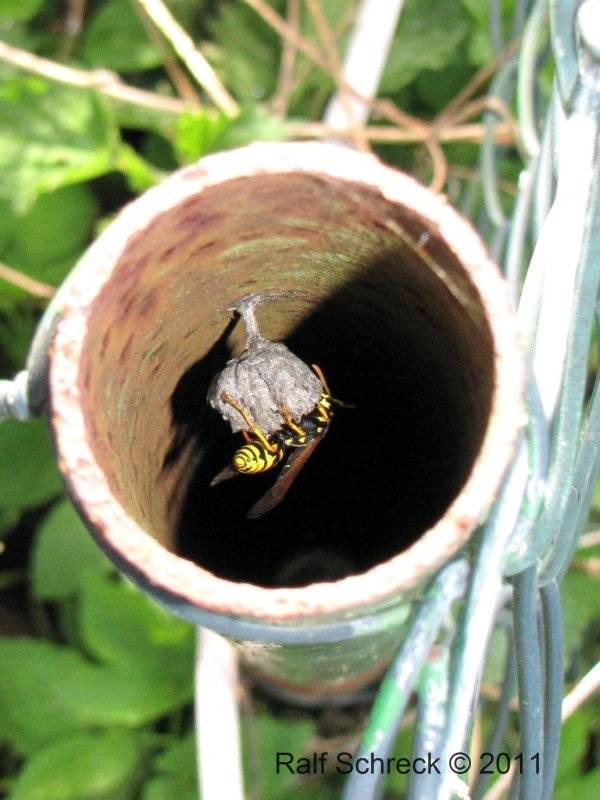 Die Nestgründung einer Feldwespe im Zaunrohr seines Gartenzauns. |