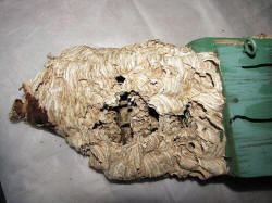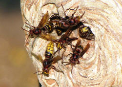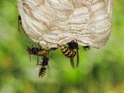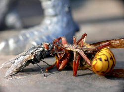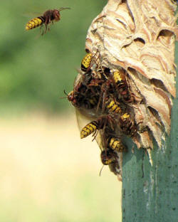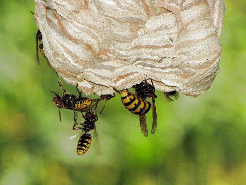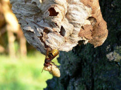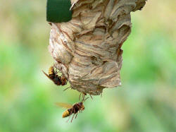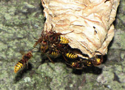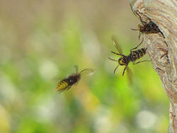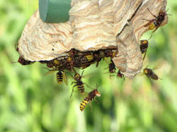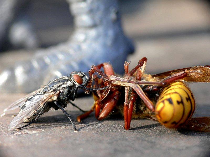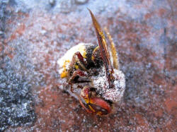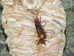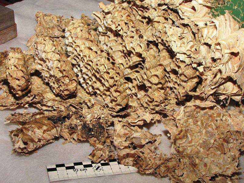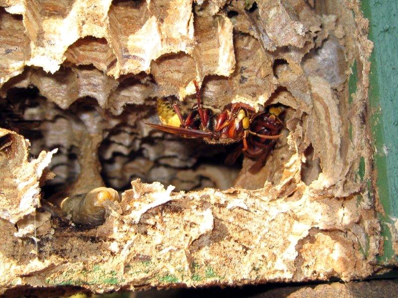 werden von den Hornissen Larven aus dem Nest getragen. Im Abfallhaufen