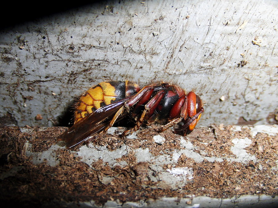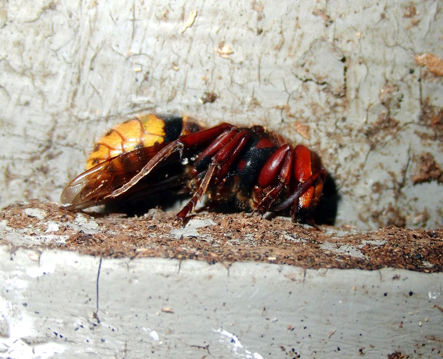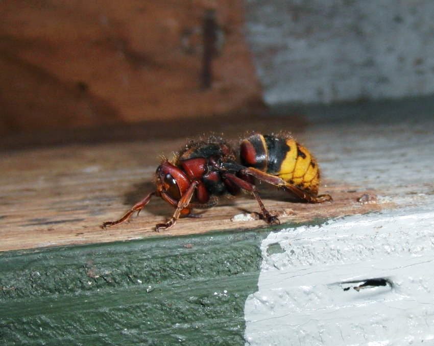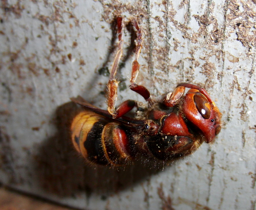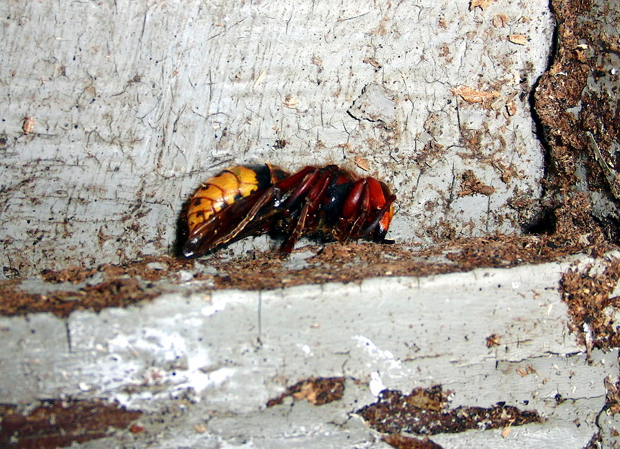 Hornissenkönigin aus dem Kasten. Sie ist steif und hat die typische