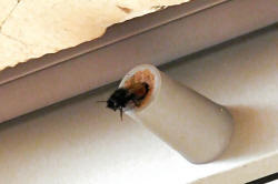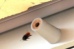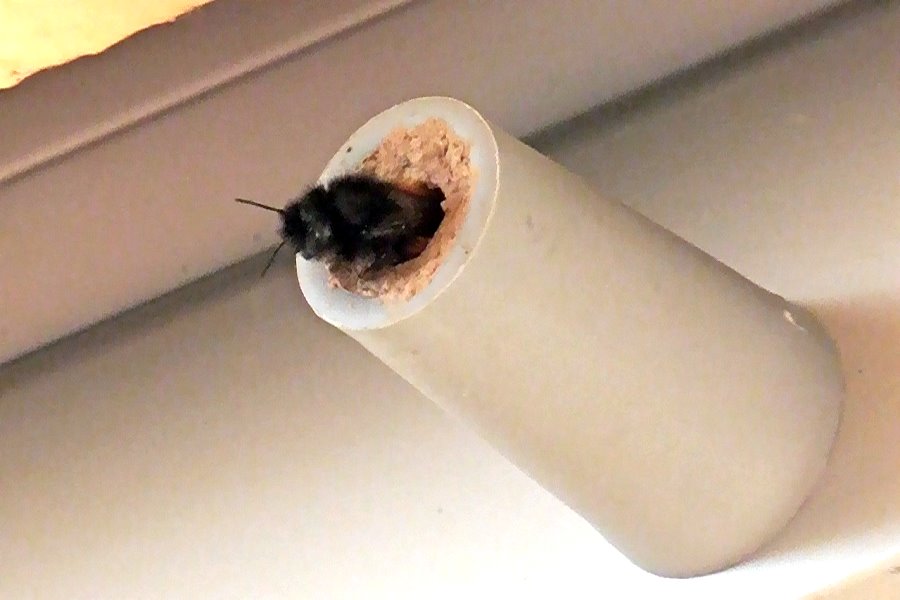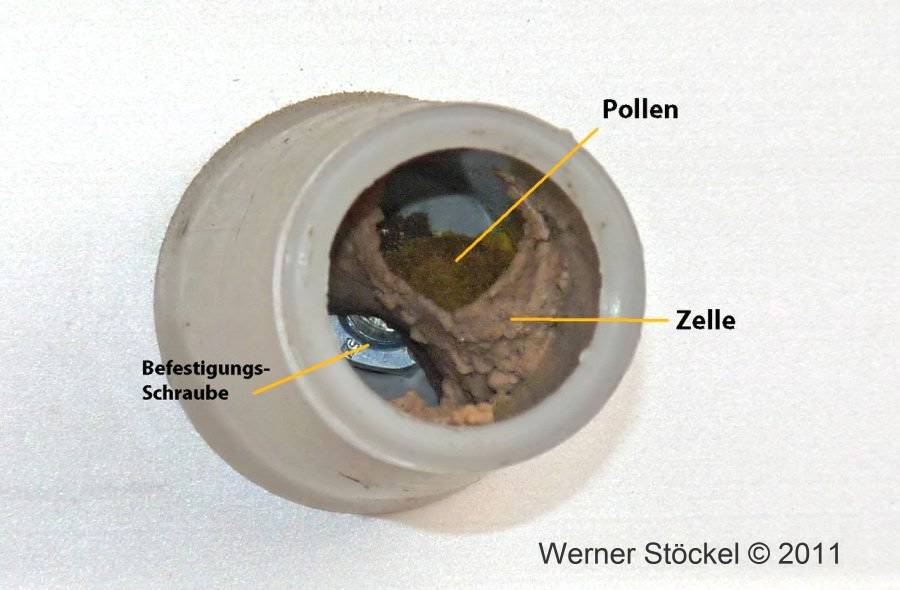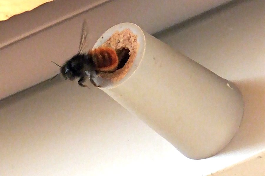 das Wildbienenweibchen damit, die Brutröhre, hier den Rollladenstopper