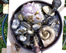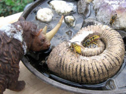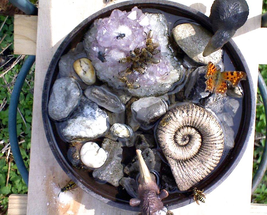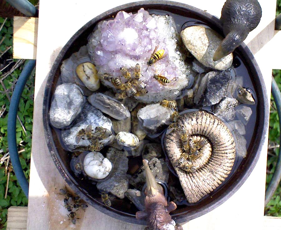 Futterschale, gefüllt mit Zuckerwasser, Wespenköniginnen, Bienen und