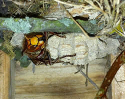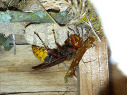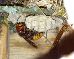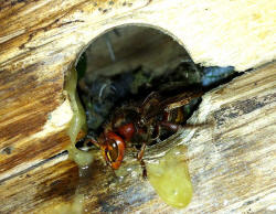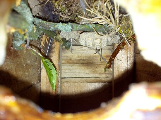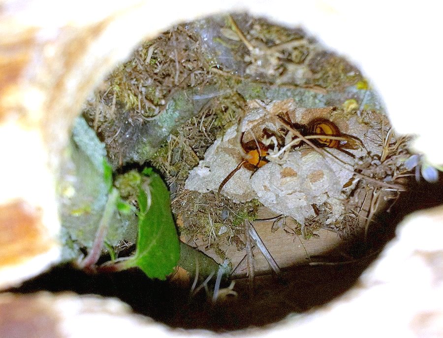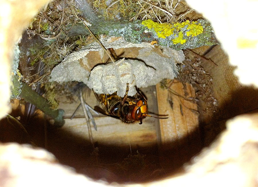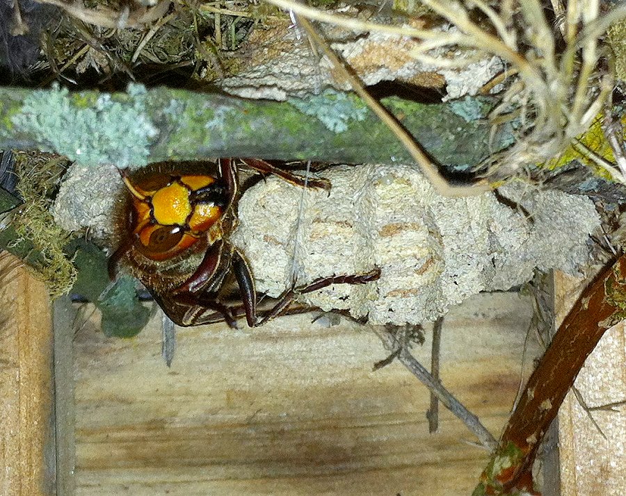 zeigen die Hornissenkönigin bei der Brutpflege im Vogelkasten.