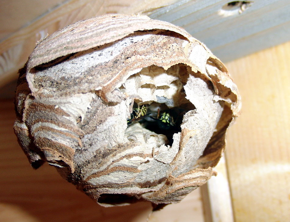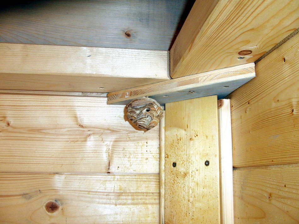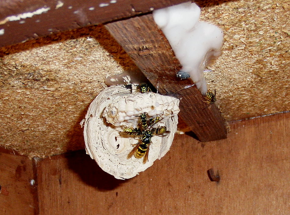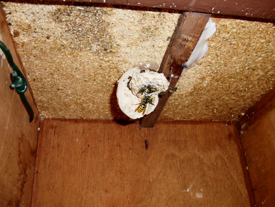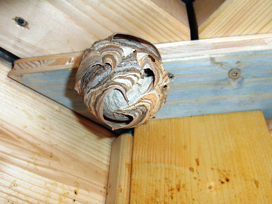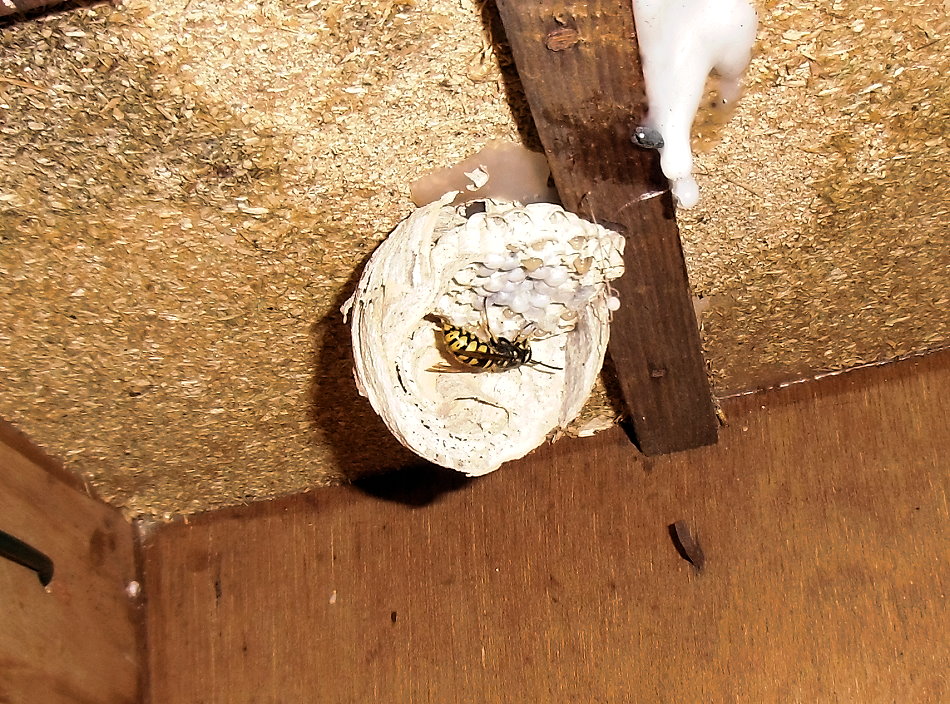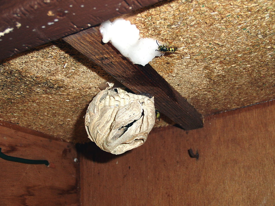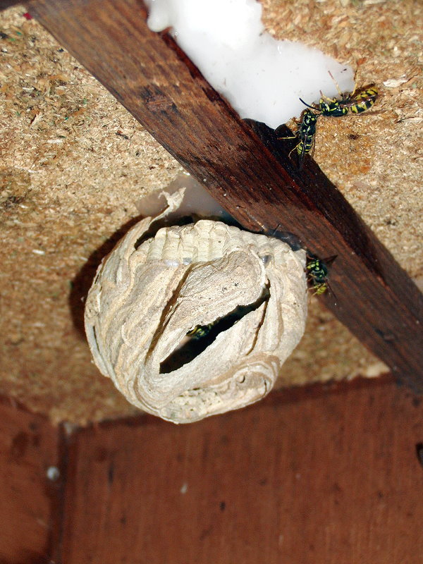 Wie sollen hier die paar Wespen die kleine Wabe am Dach des