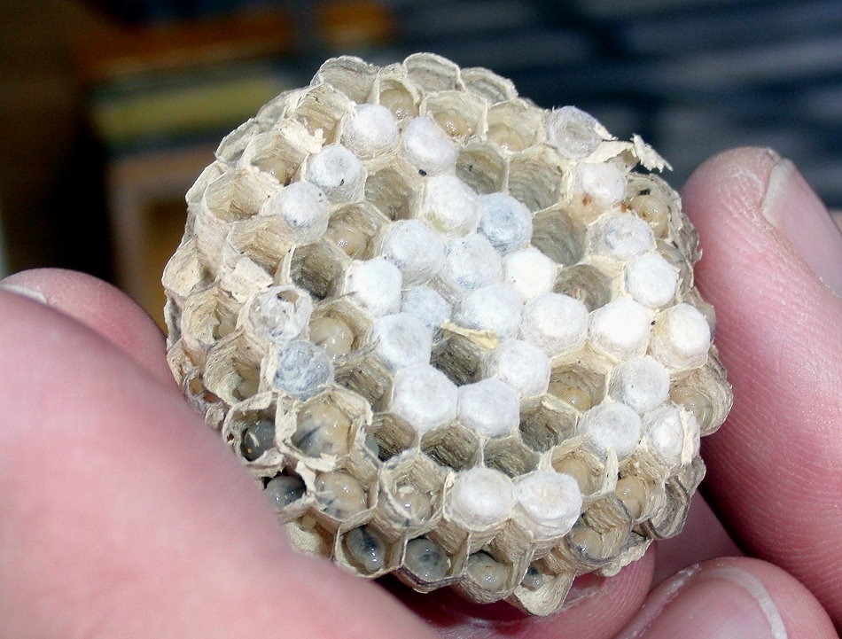 Nesthülle kann man die Larven und Puppen in den Wabenzellen erkennen.