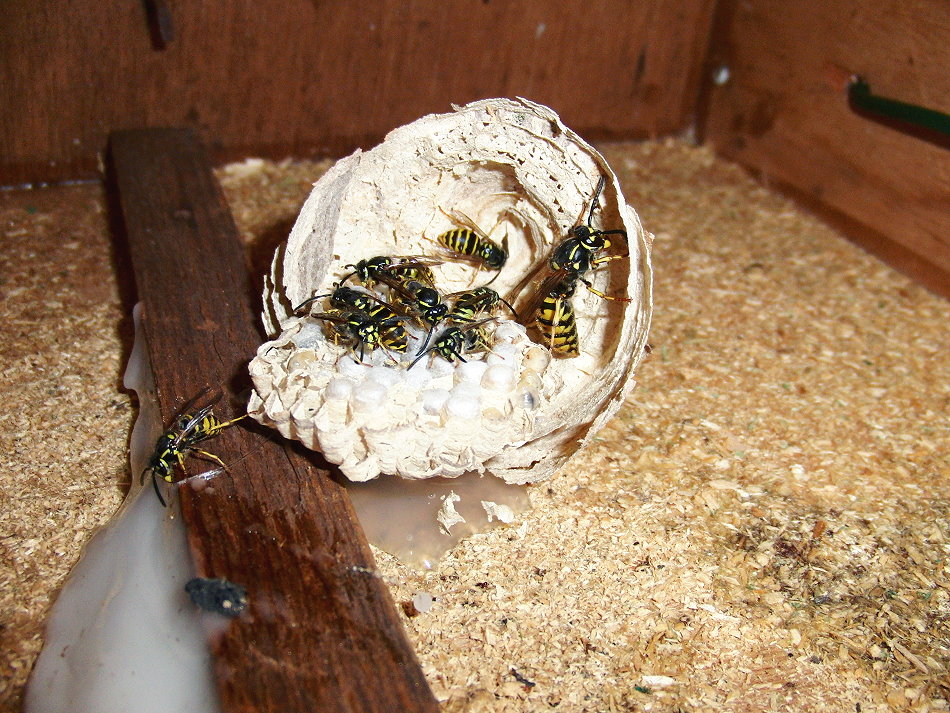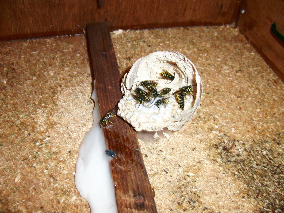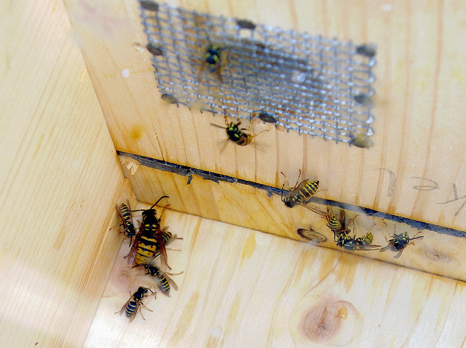 Verteidigungsverhalten. Auf dem Kastenboden finde ich zwei tote Wespen.
