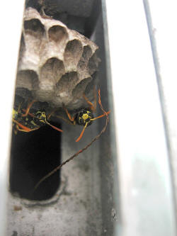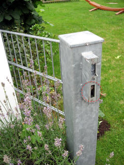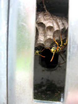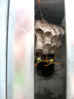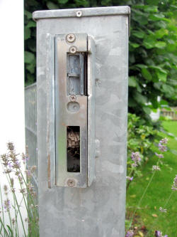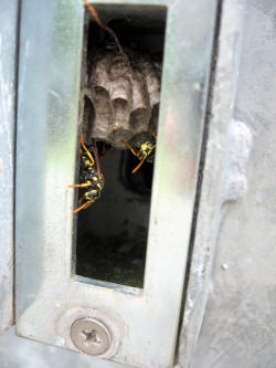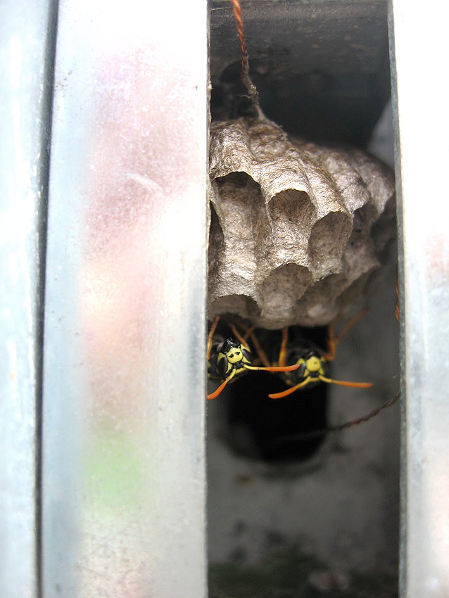 Obwohl schon knapp 3 Monate am Standort, wurde sie erst jetzt entdeckt - eine kleine Feldwespenkolonie im Türschloss eines Gartentores.
