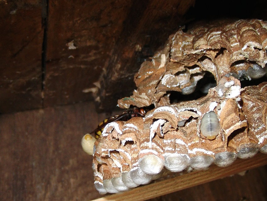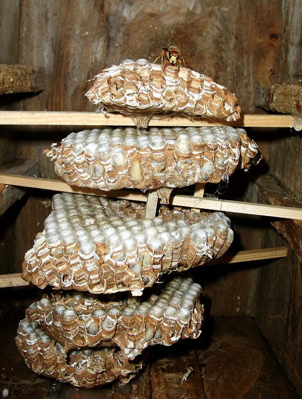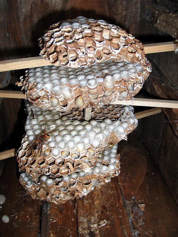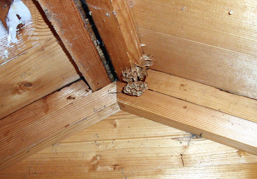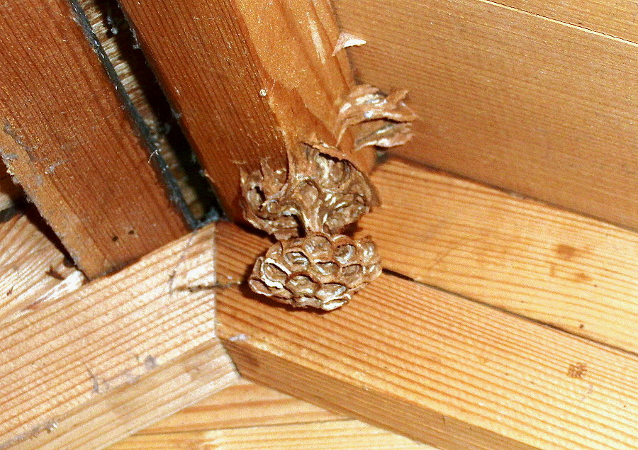 Die frisch begonnene Filiale des Hornissennestes in der Gartenhütte.