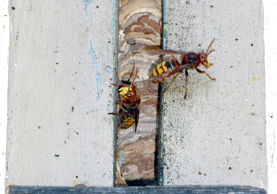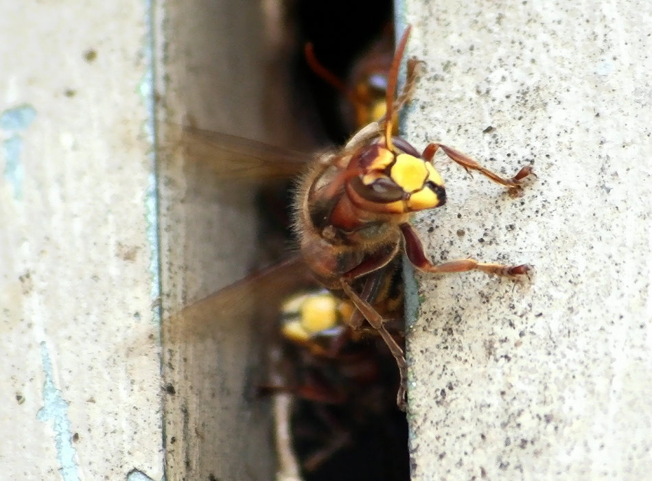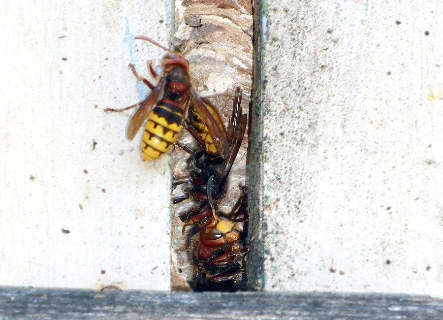 dem Hornissenkasten. Gleich ist ein zweites Männchen zur Stelle und