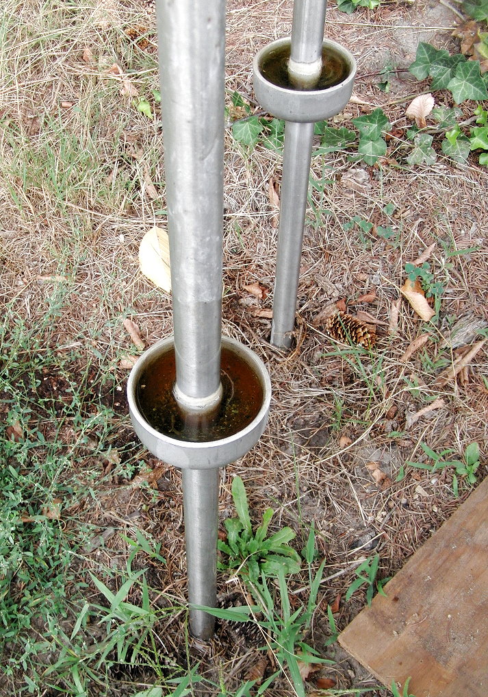 befestigt. Mit Wasser befüllt dienen diese als Barriere gegen Ameisen.