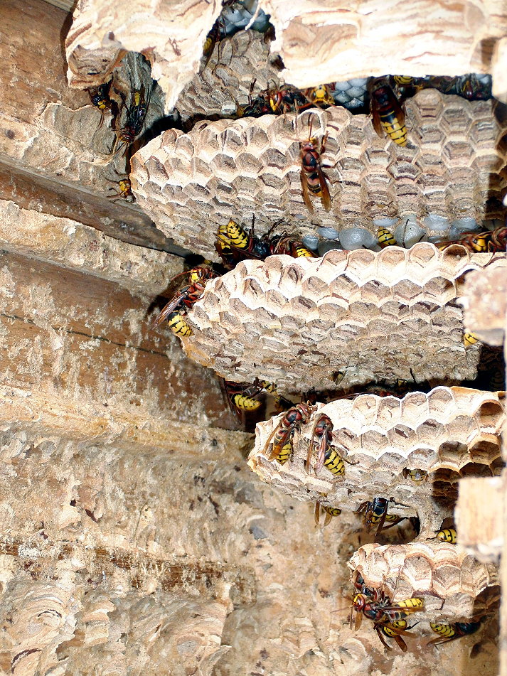Wabenteile eines alten Hornissennestes, welche die Nistplatzsuchende