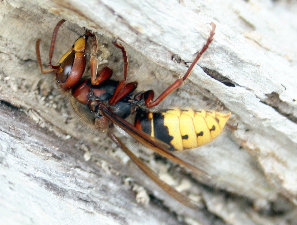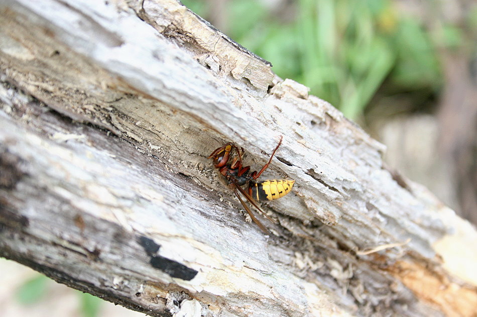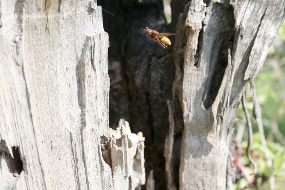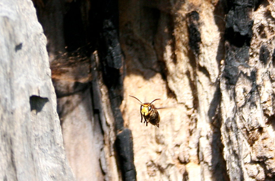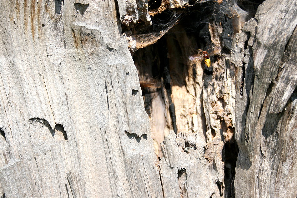 Rege werden die morschen Holzteile von Hornissen beflogen, die hier ihr