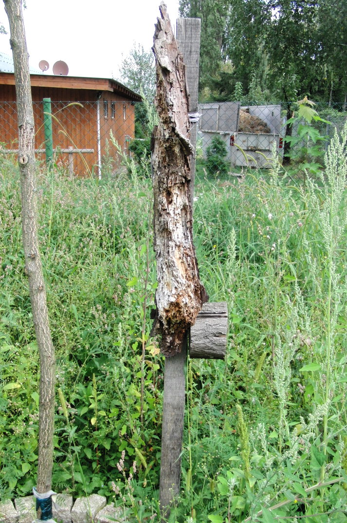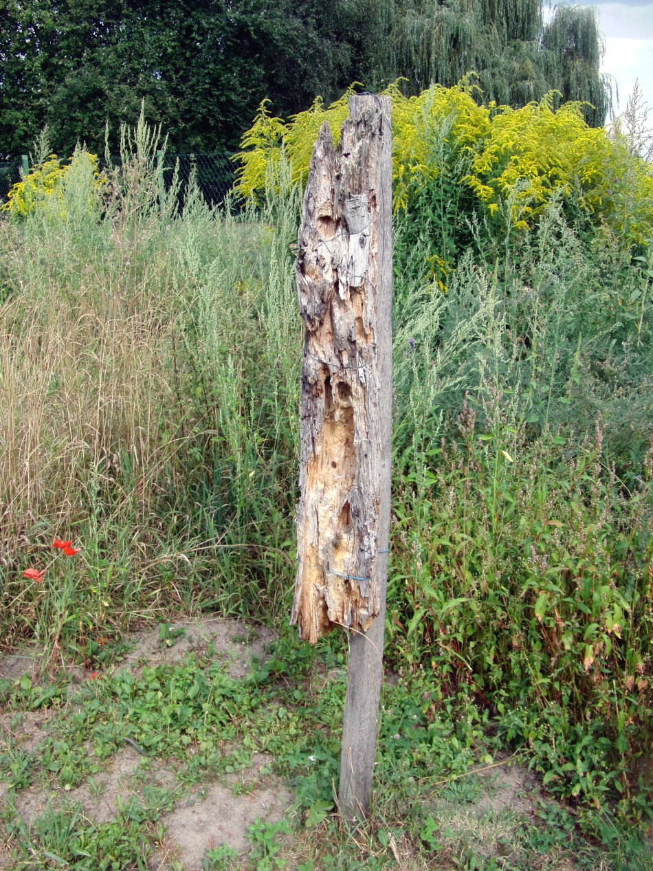 Totholzstämmen, auch morsche Stammteile an Pfählen befestigt.