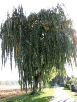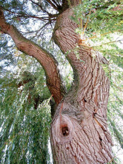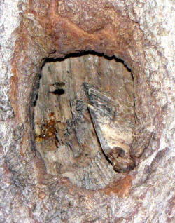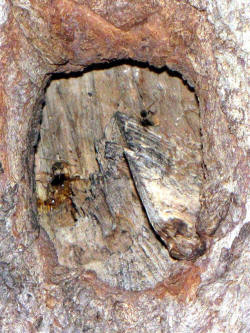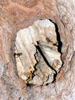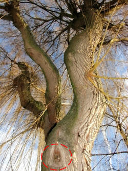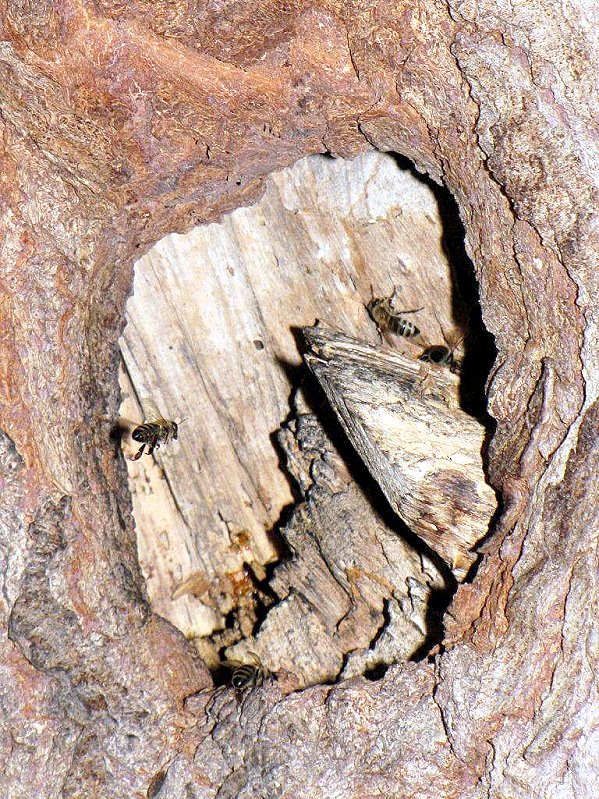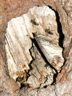In einer Trauerweide fliegen Honigbienen ein Astloch