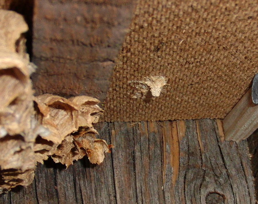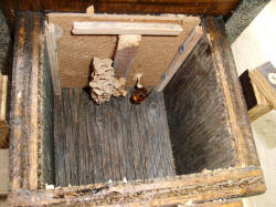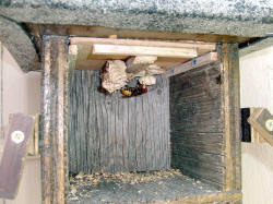 Auf dem Boden des Kastens sieht man abgeraspelte Nestfragmente liegen.