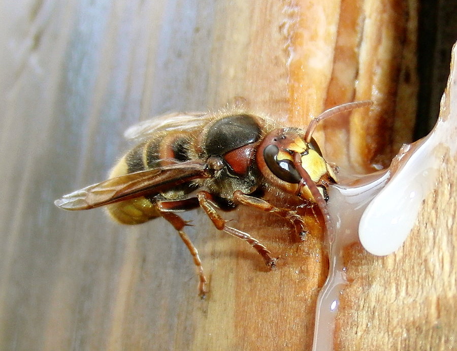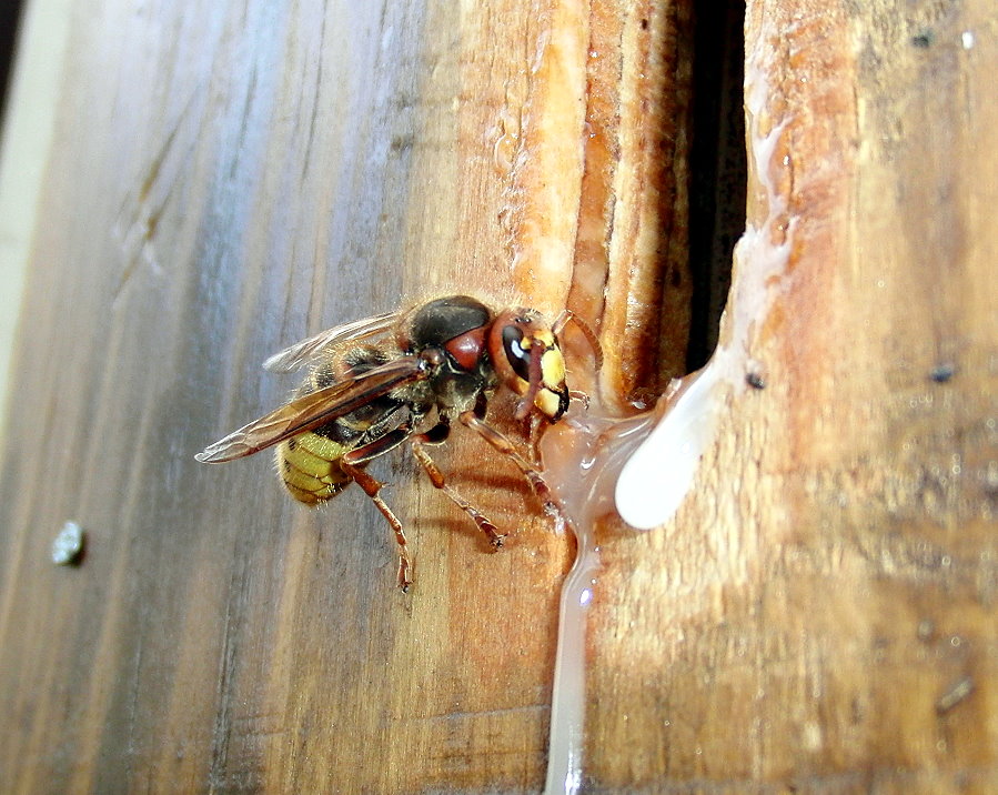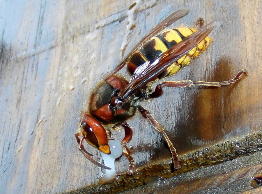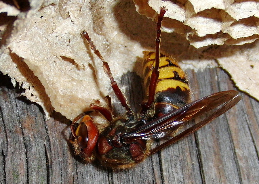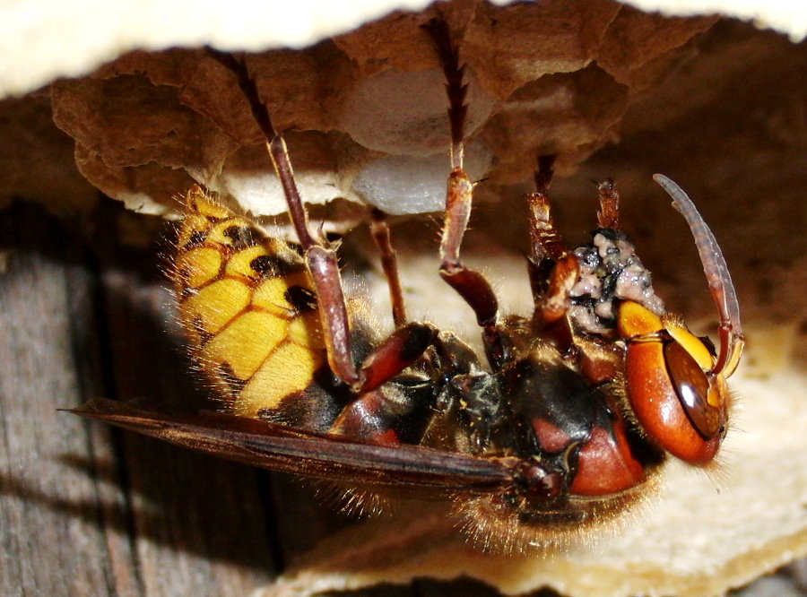 Hornissenkönigin hat hier bereits angefangen, Wabenteile abzutragen.