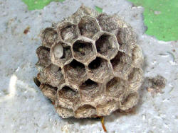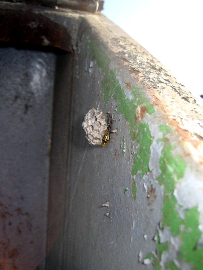 Feldwespennest seitlich an der Wand des Papiercontainers.