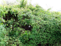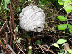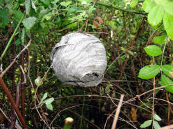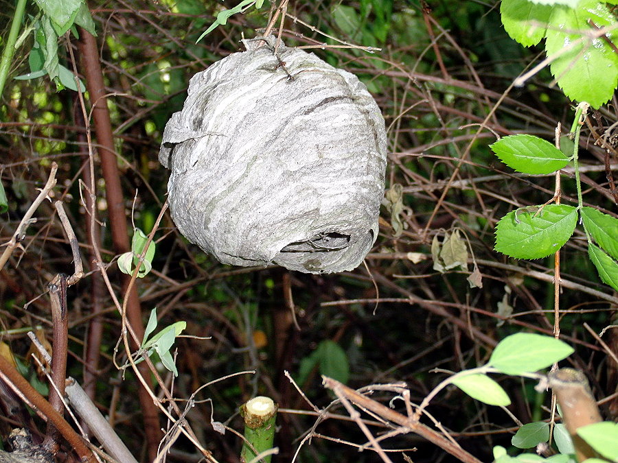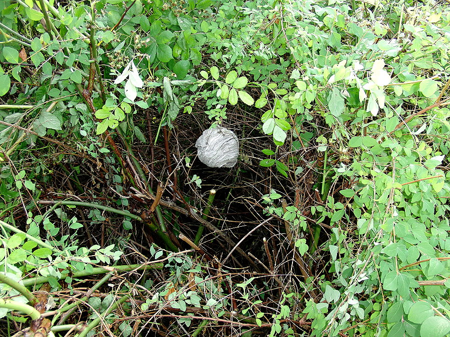 In der Hecke hängt das etwa Apfelsinengroße Nest der Mittleren Wespe. Es