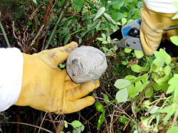 Nun wird das Nest aus dem Gestrüpp abgenommen. Es hängt an einem sehr