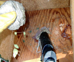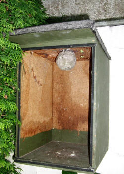 Pinzette, direkt auf das Einflugloch und auf die Nesthülle. Die