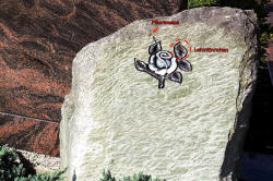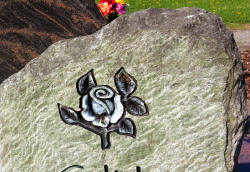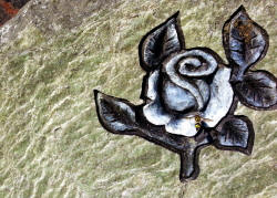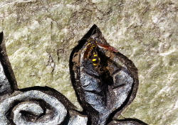 An solch einem kontrastreichen Untergrund ist es schwierig seine erbauten Brutzellen zu finden. Am Rosenblatt, oben rechts befinden sich die kleinen Brutzellen, die von der Pillenwespe am Grabstein werden.