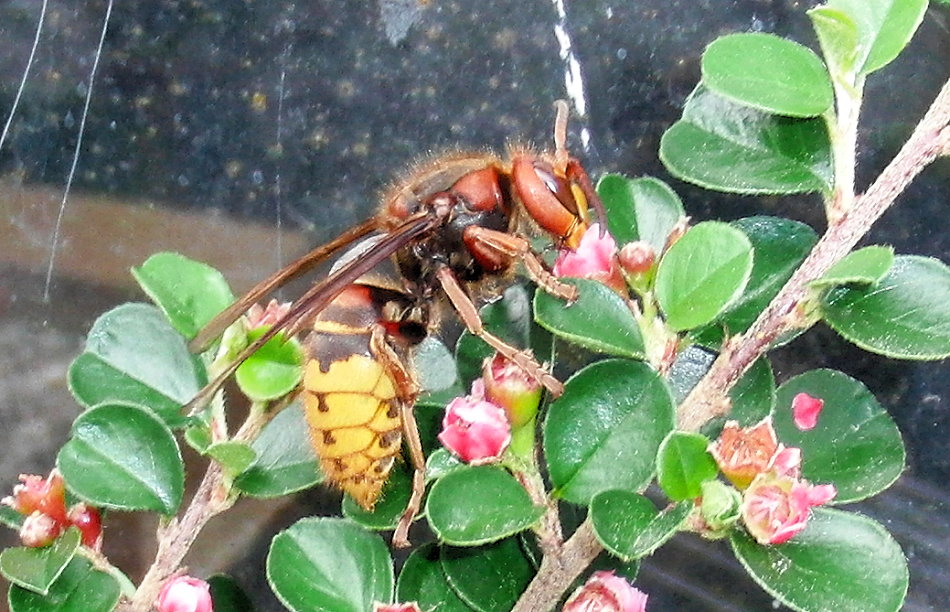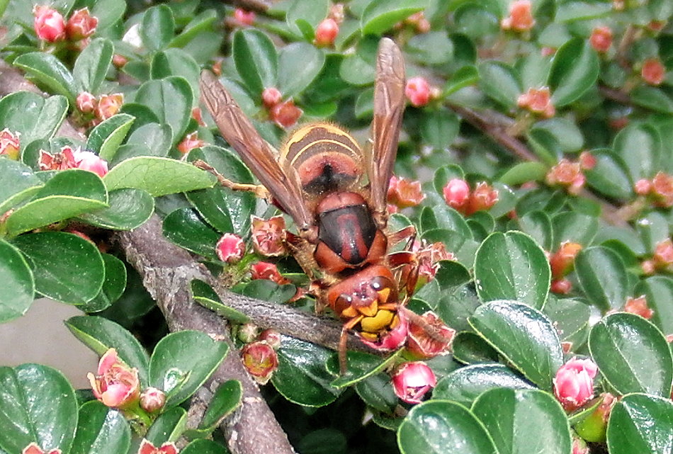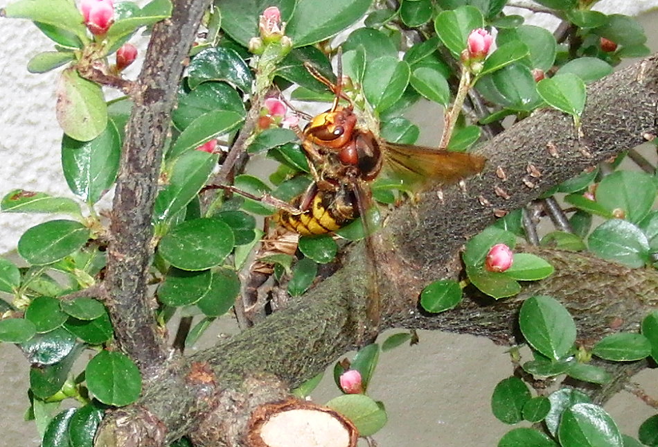 Hornissen an der Fächermispel und stoßen im Flug beinahe zusammen.