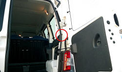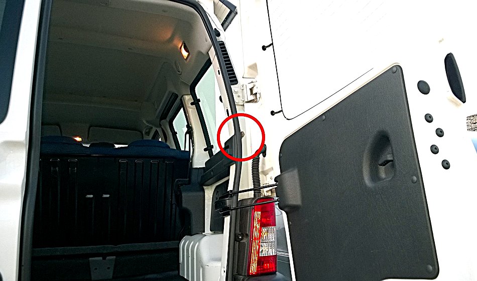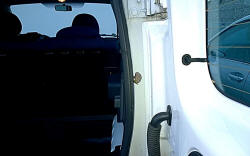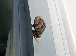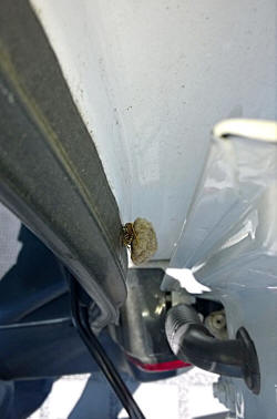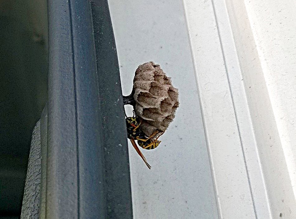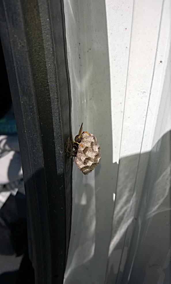 Einen denkbar ungünstigen Neststandort hat sich diese Feldwespen-Königin ausgesucht: ... Im Rahmen, an der Hecktür, eines kleinen Lieferwagens ...