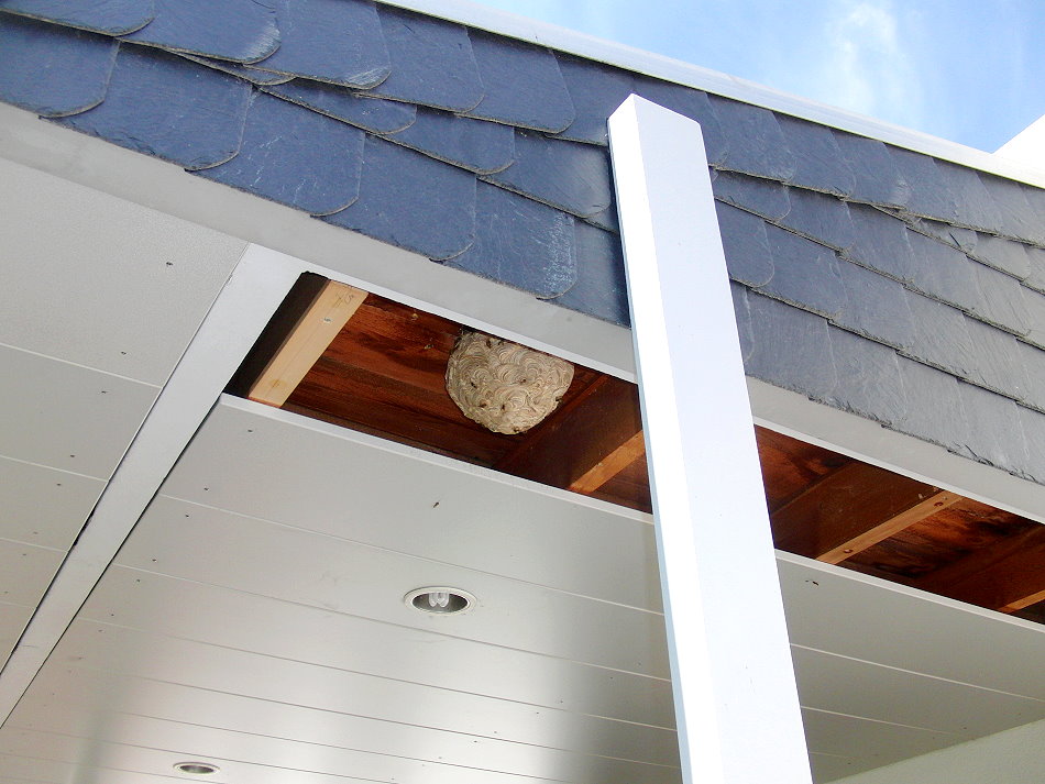 der Holzverkleidung am Vordach, verrät den Standort des Nestes.