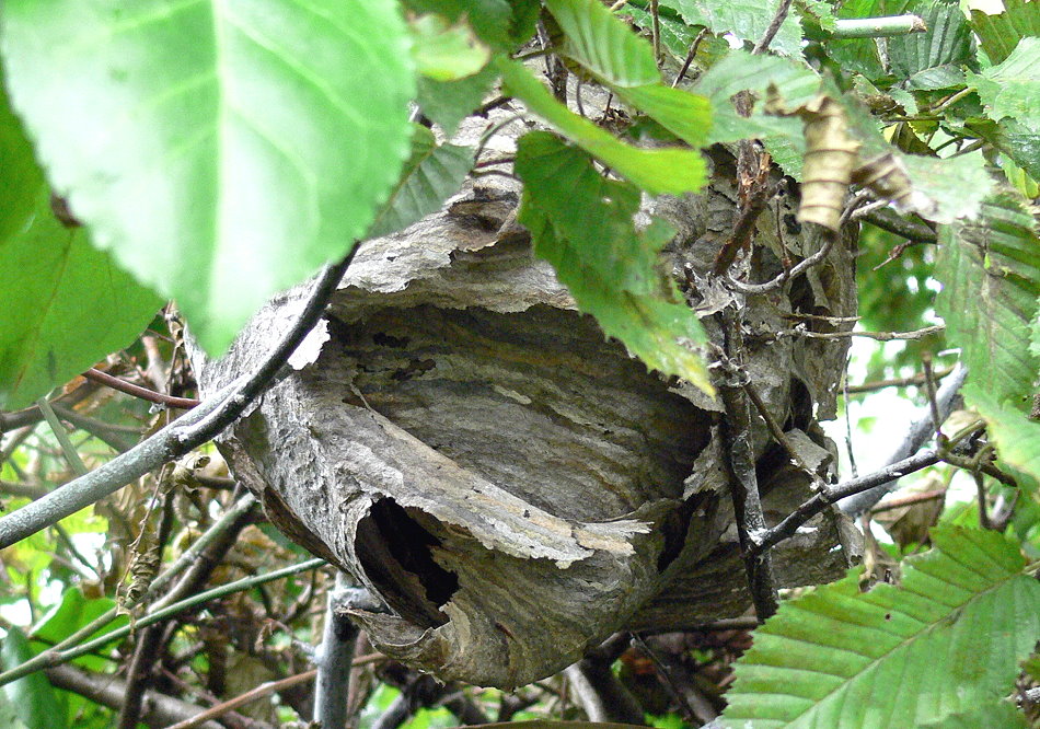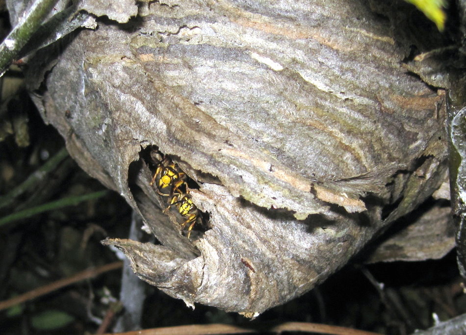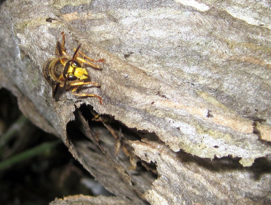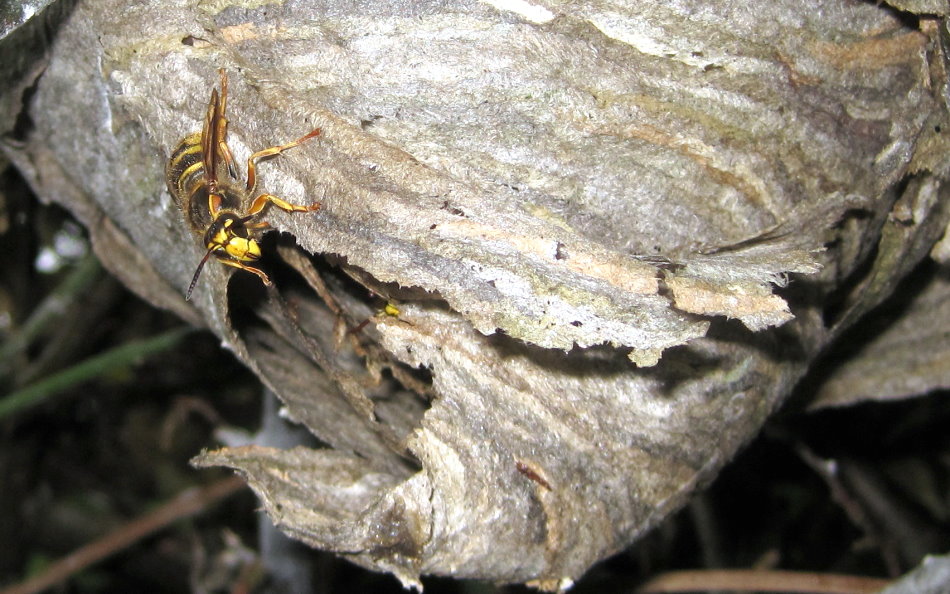 Aufgerissenes Nest der Mittleren Wespe auf dem Friedhof