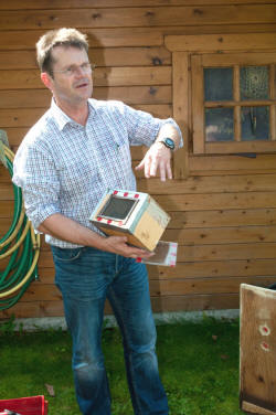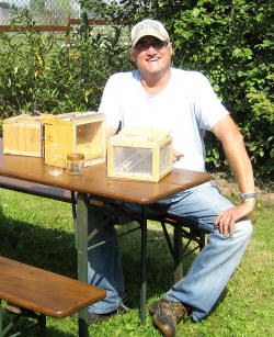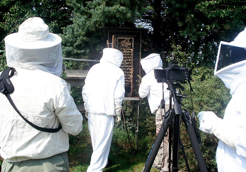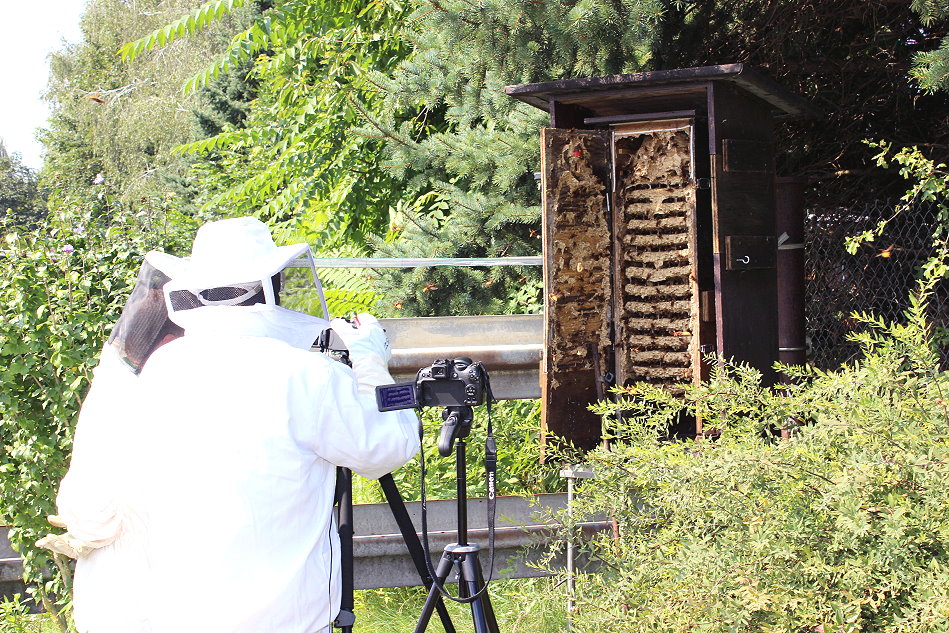 Zenner beobachtet ein Feldwespennest im Lockkasten sowie dessen Bewohner