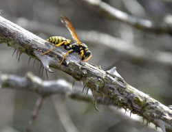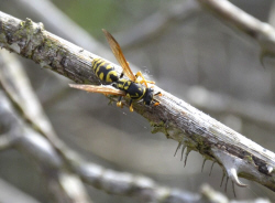 bei, dass die Blüten befruchtet werden. Hier ist es z. B. eine Feldwespe.