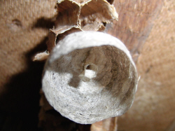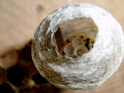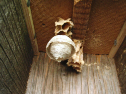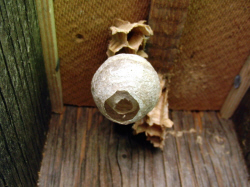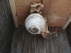 aufgehängten Lockkastens, entdecke ich die kleine Nestkugel einer Wespenart.
