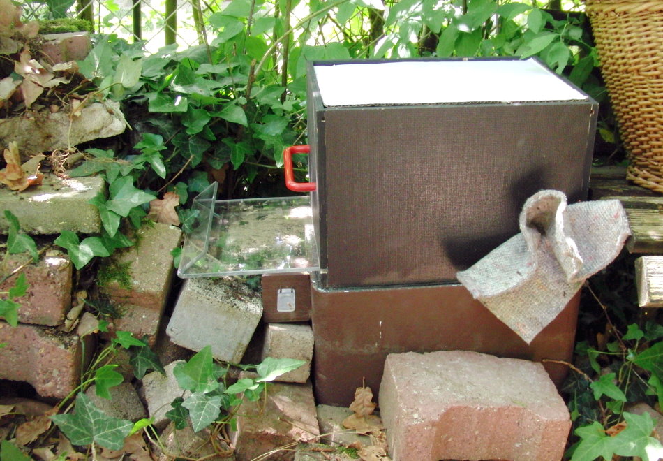 Die Abfangbox passt genau auf den Hummelkasten. Der Plexiglasschieber