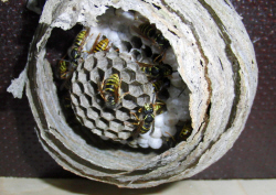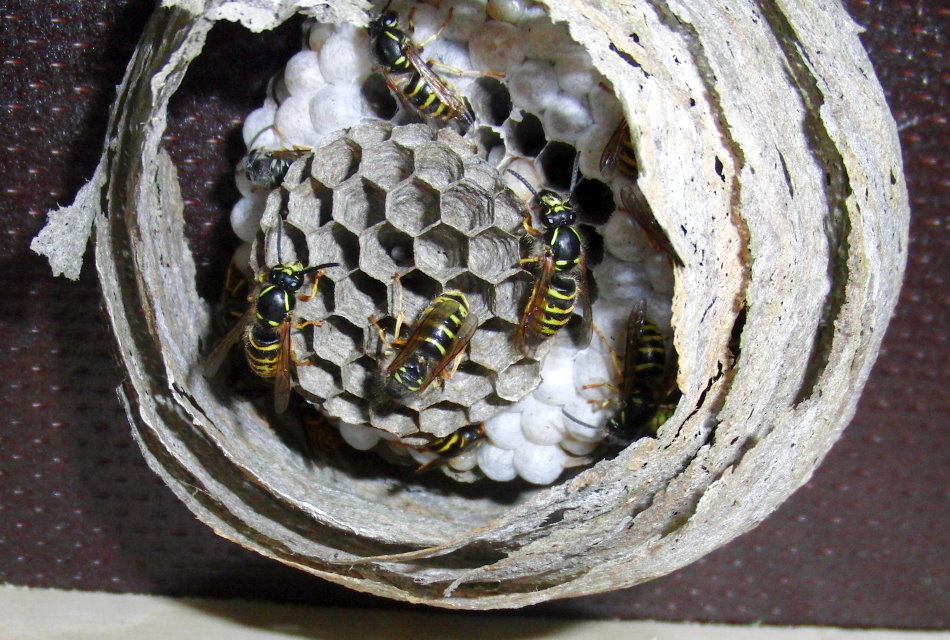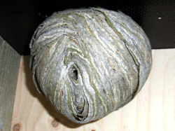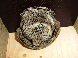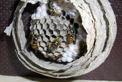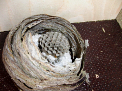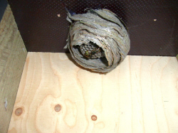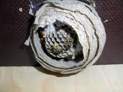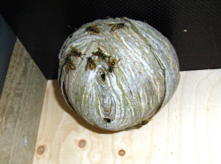 S., hat die Königin einer Sächsischen Wespe ihr Nest, an die Holzdecke geheftet.