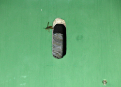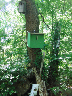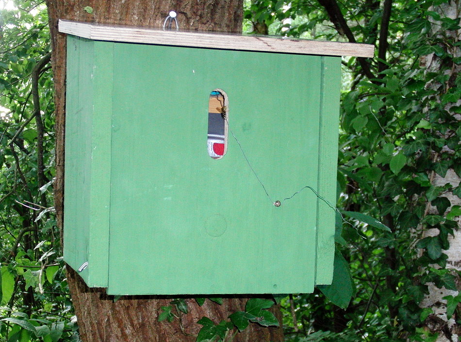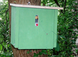 Umsiedlungskasten und schaut sich am Flugloch um. Im Inneren steht die