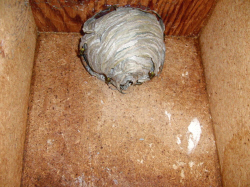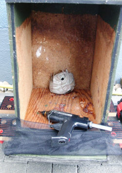 Bild 2: Das entnommene Nest wird in den Umsiedlungskasten eingeklebt