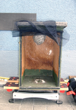 Umsiedlungskasten mit einem Fliegengitter verschlossen. Die Fangbox wird